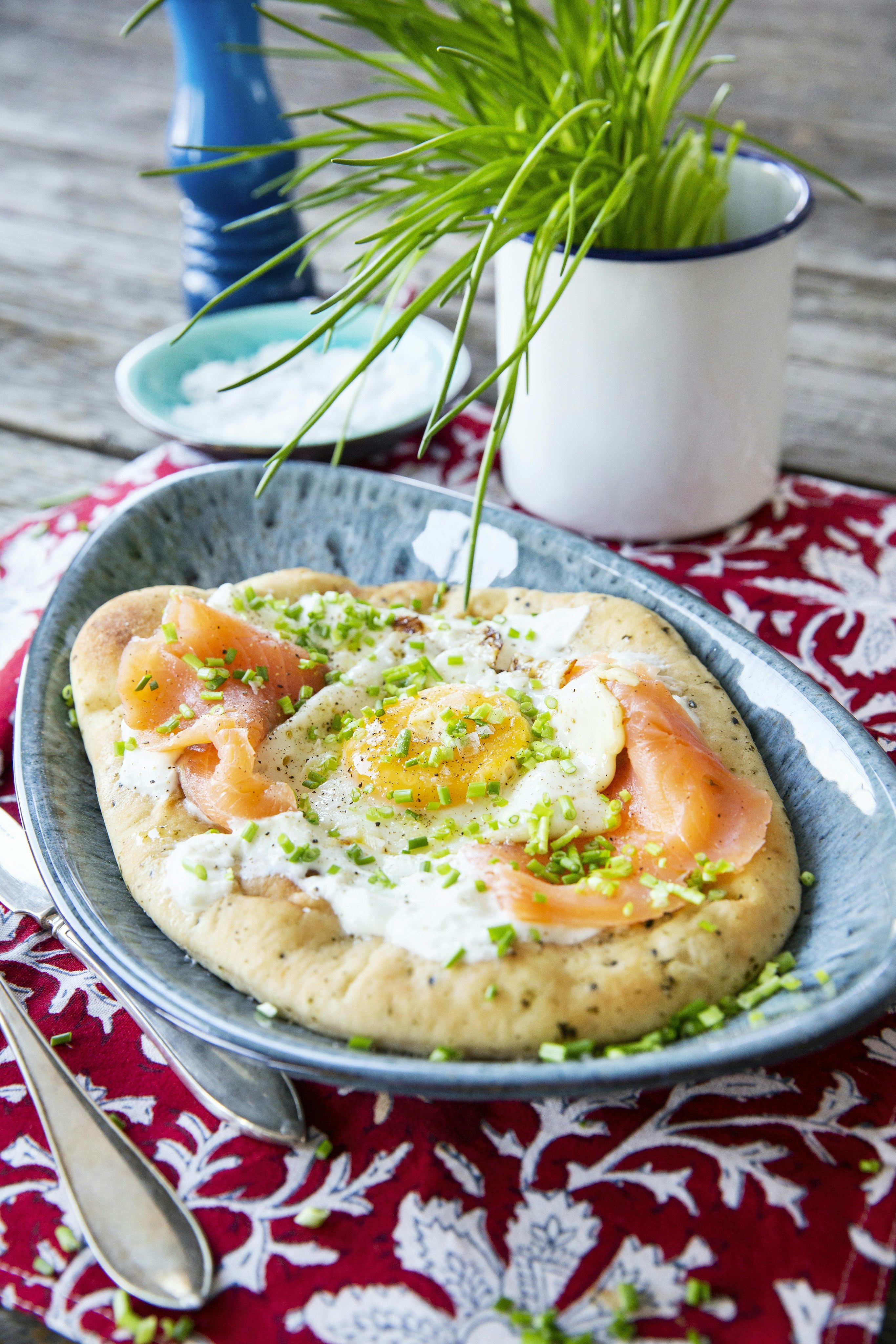 Äggmacka på naanbröd med kallrökt lax