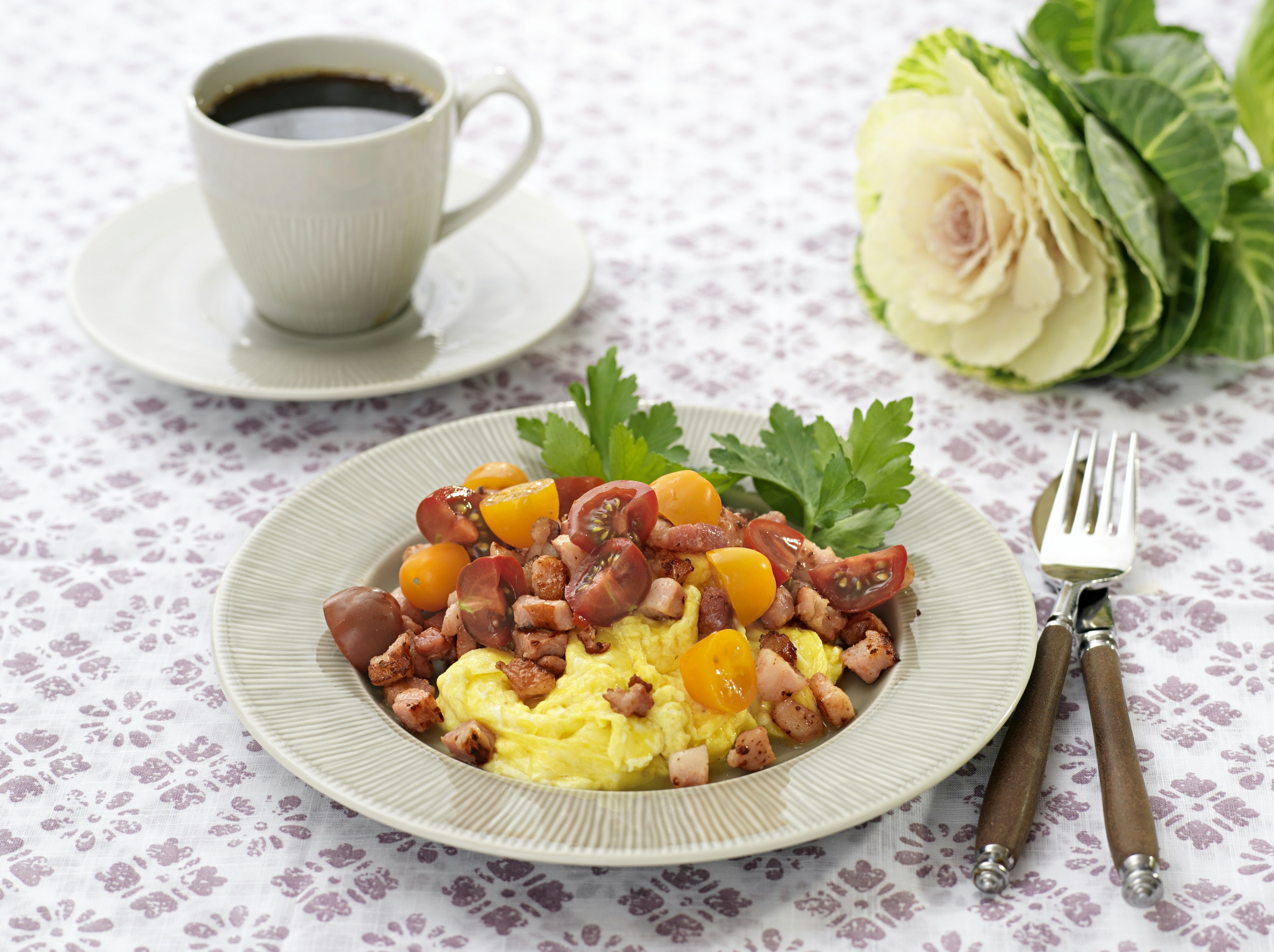 Äggröra med pancetta och tomat