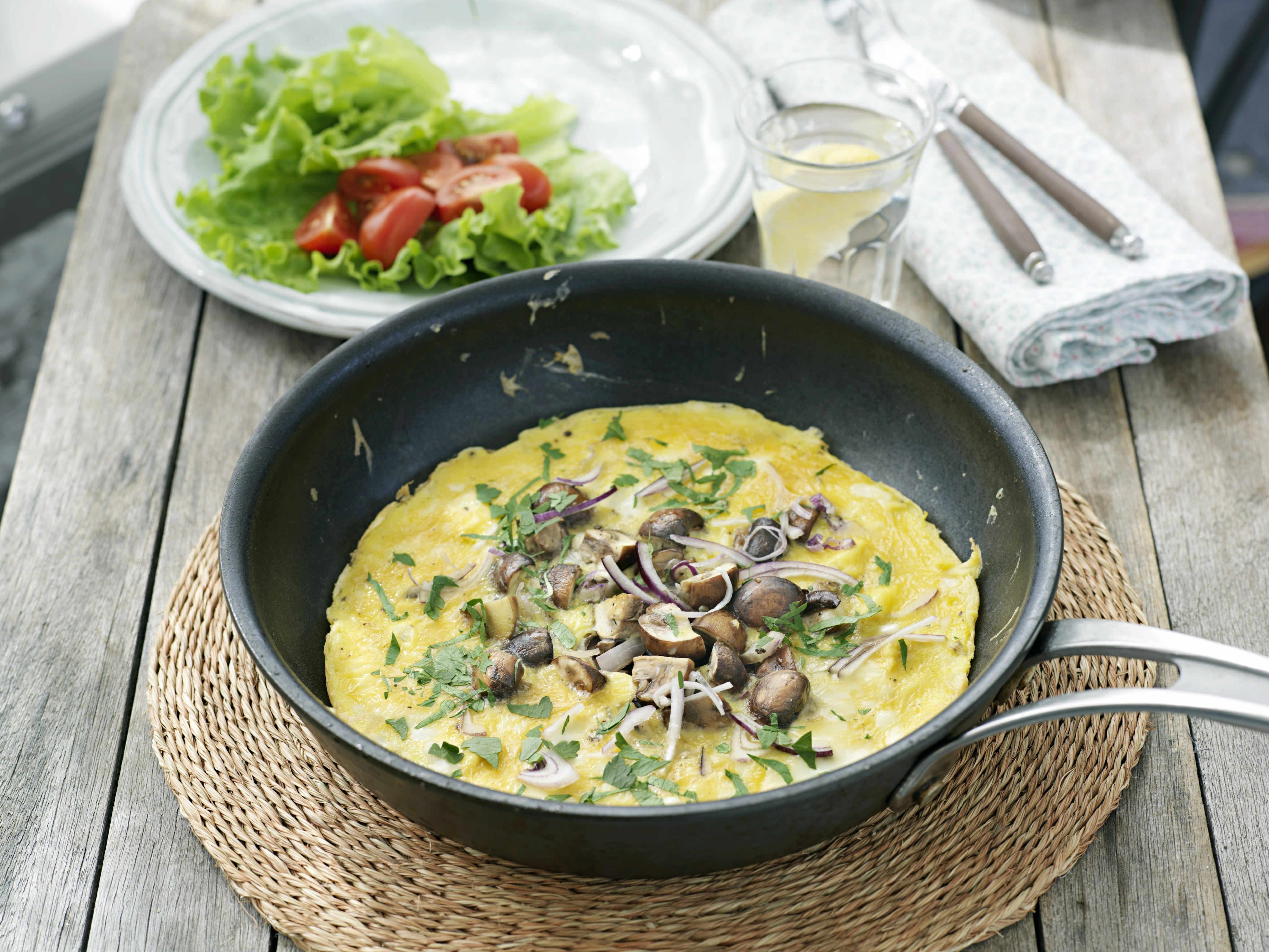 Champinjonomelett med rödlök