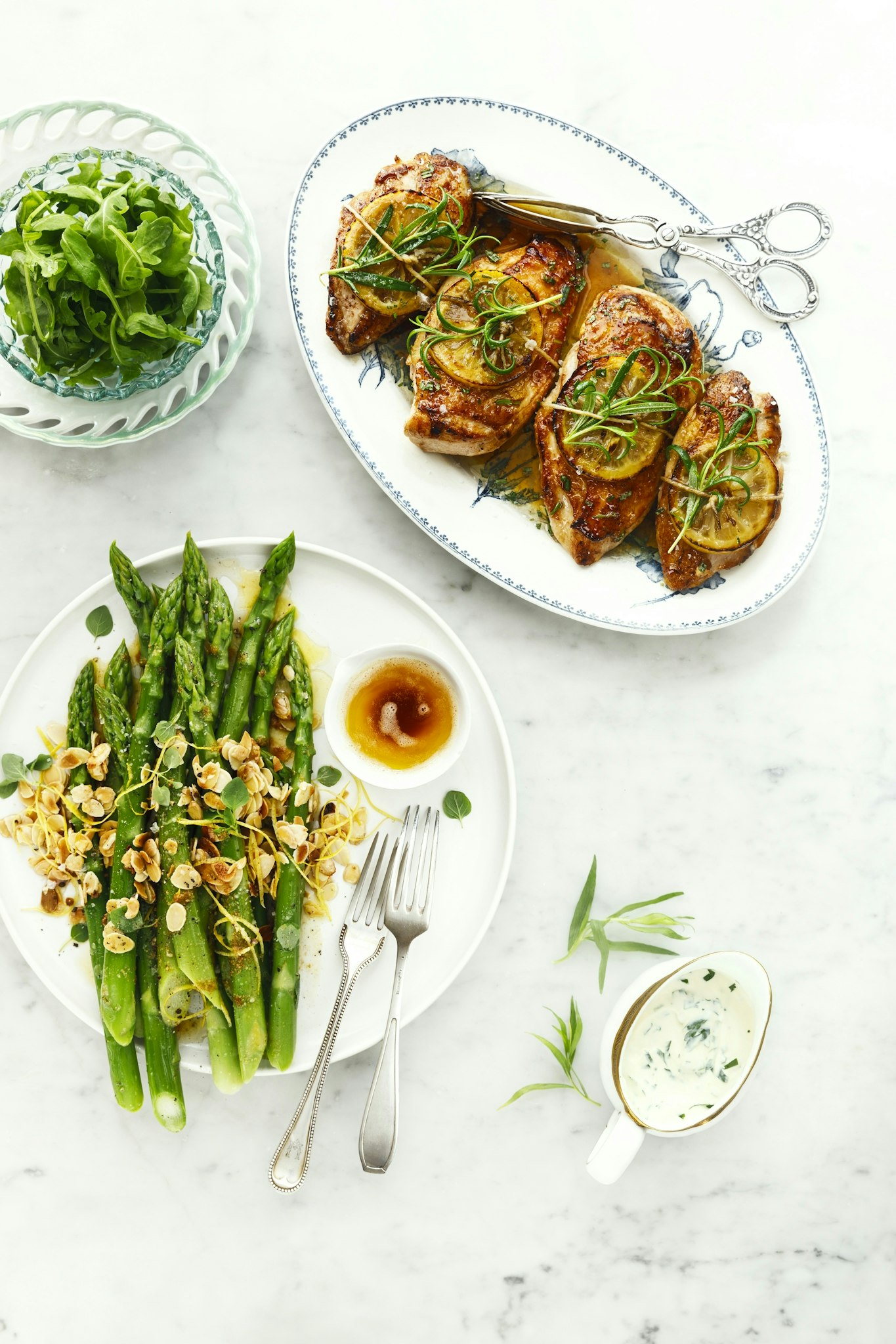 Citron- och rosmarinkyckling med rostad sparris och mild örtsås