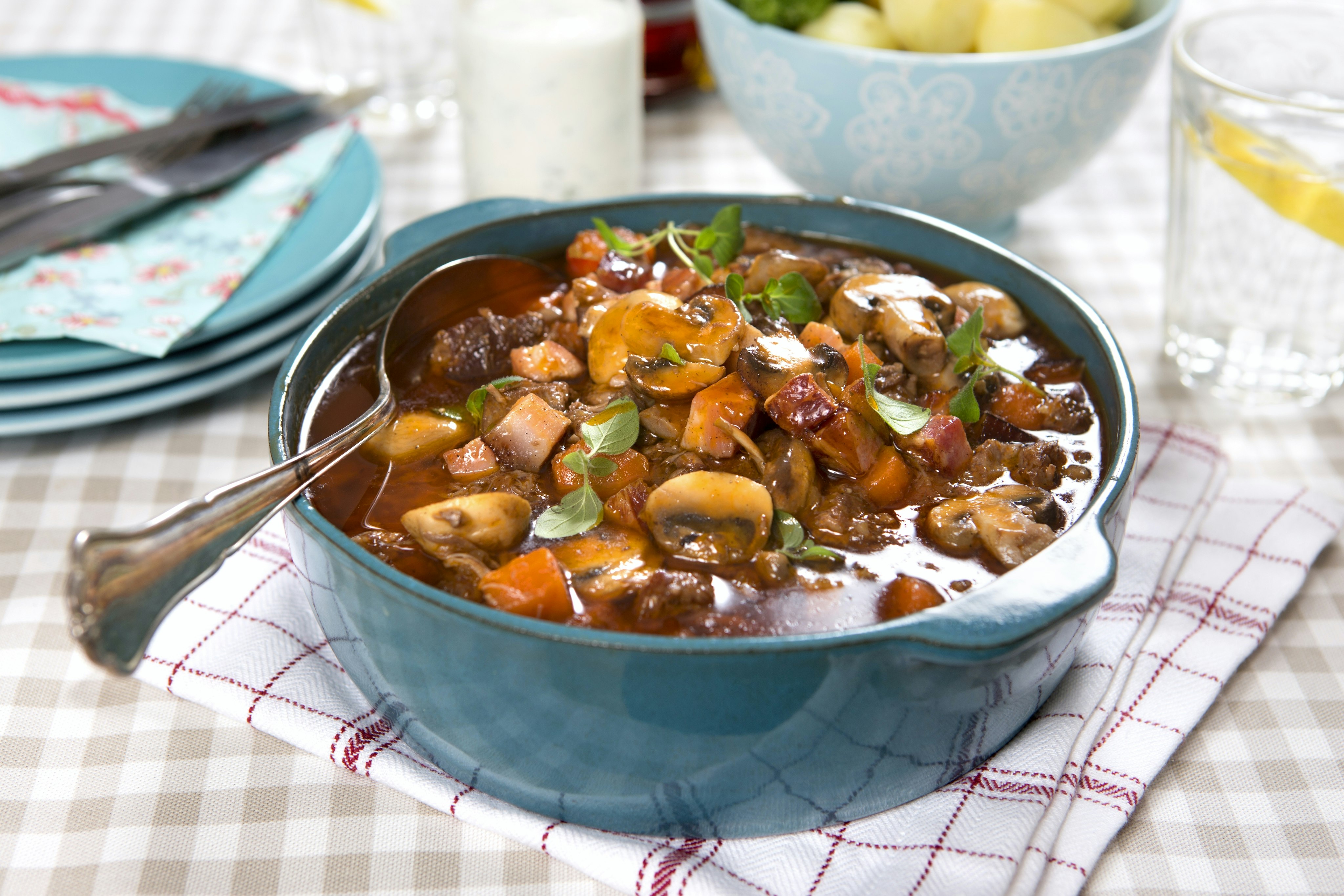 Fläskkarrégryta med champinjoner och rökt sidfläsk
