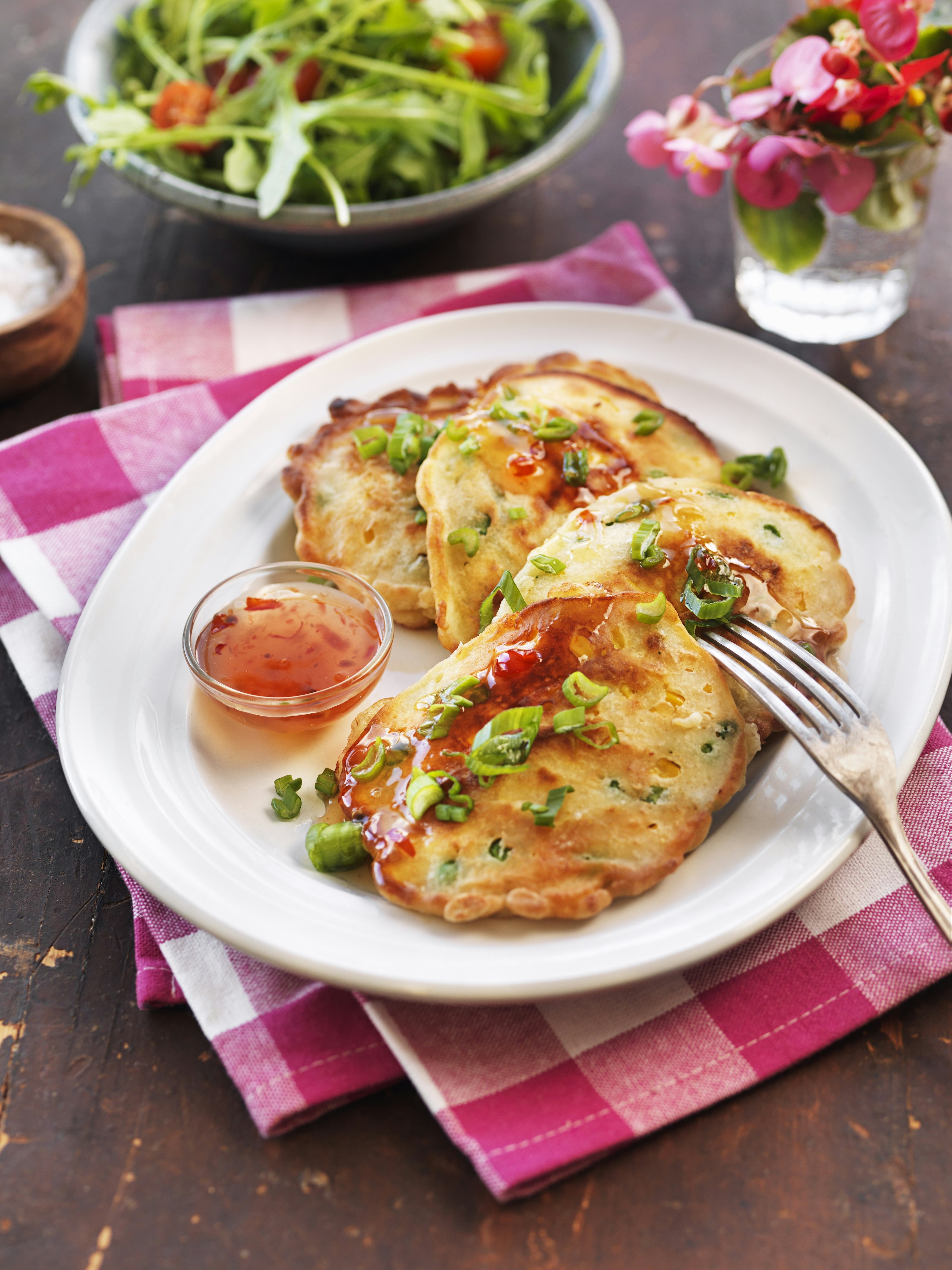 Frasiga majsfritters med sweet chilisås