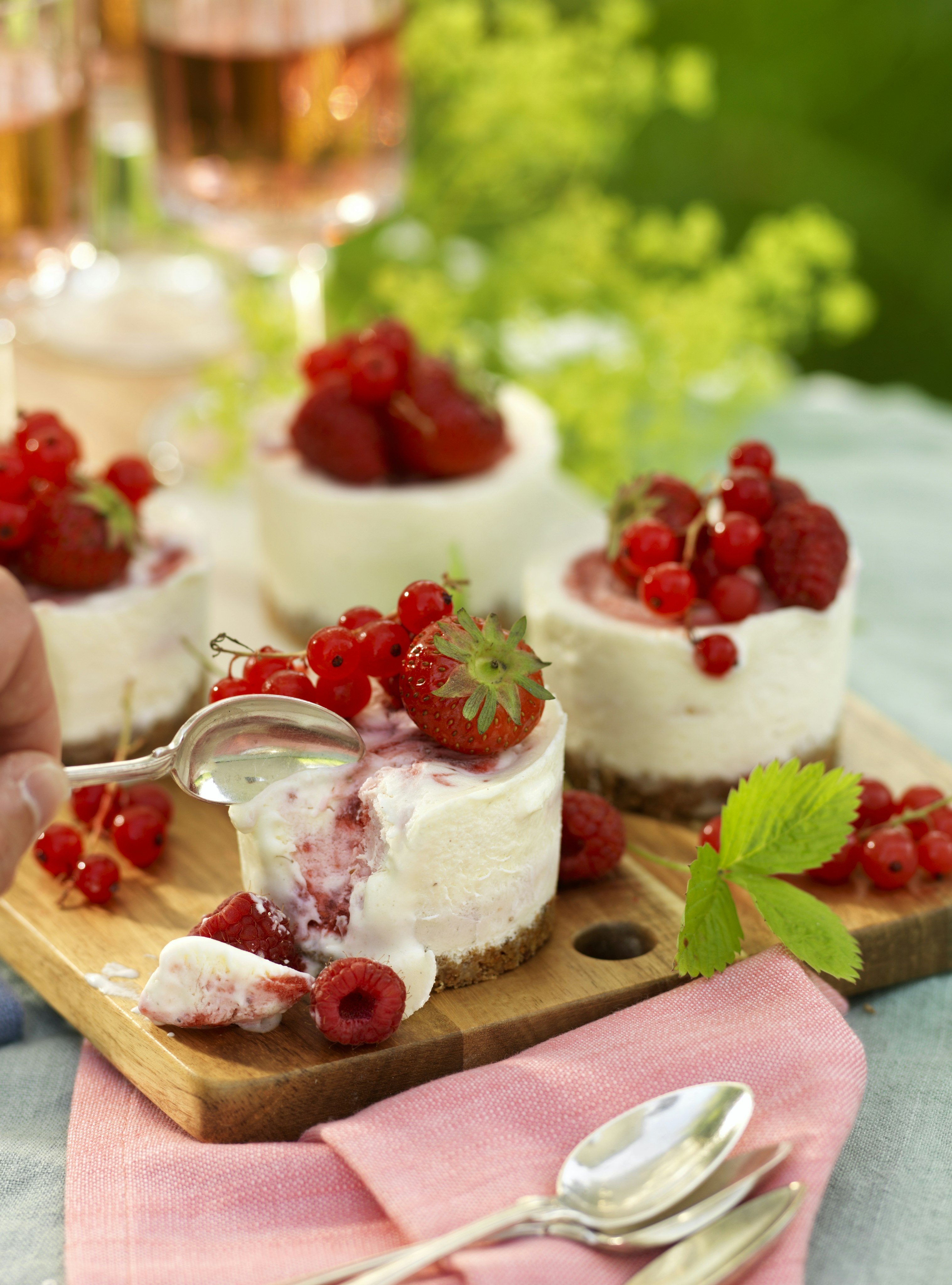Glassiga minicheesecakes med hallon