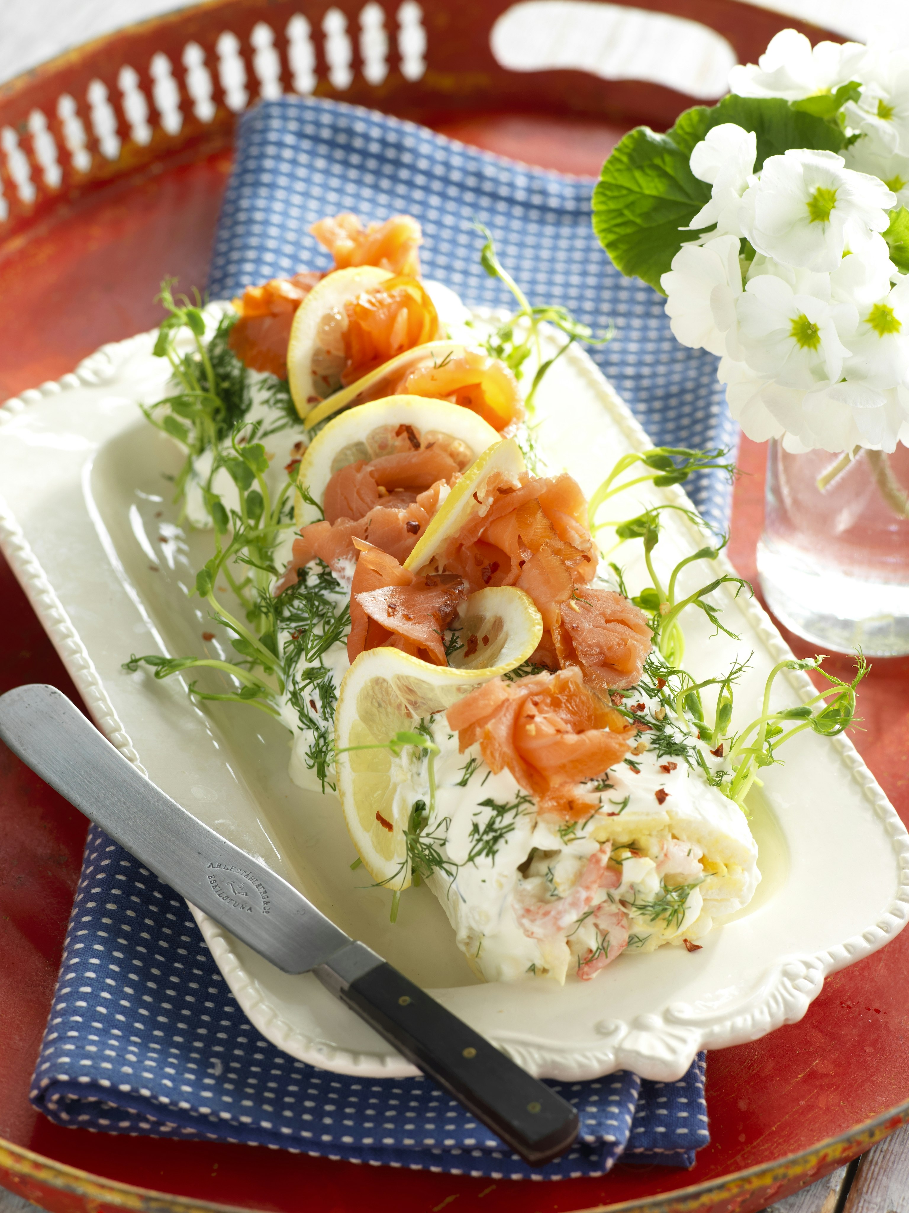 Glutenfri smörgåsrulltårta med lax och räkor