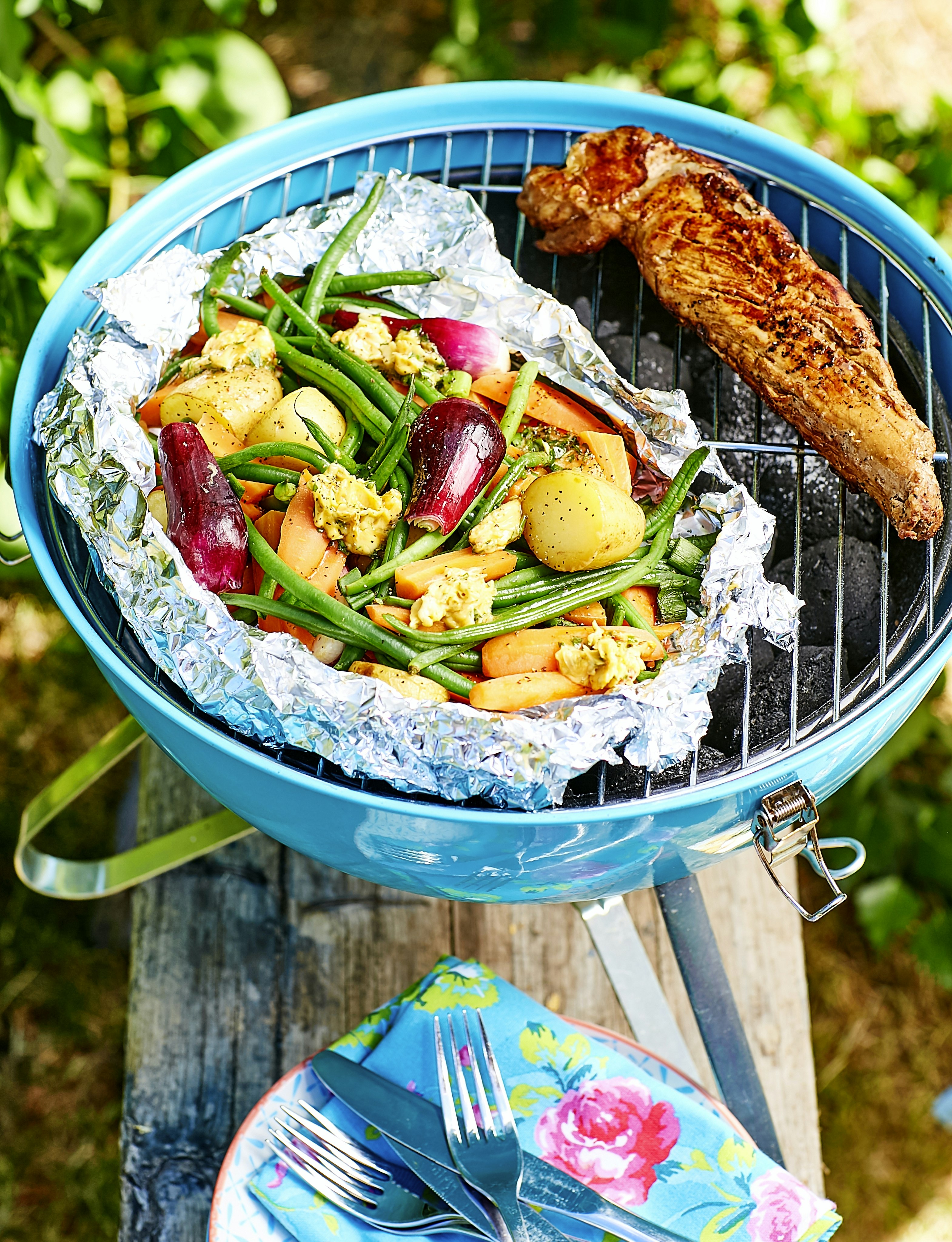 Grillad fläskfilé med potatis- och grönsakspaket