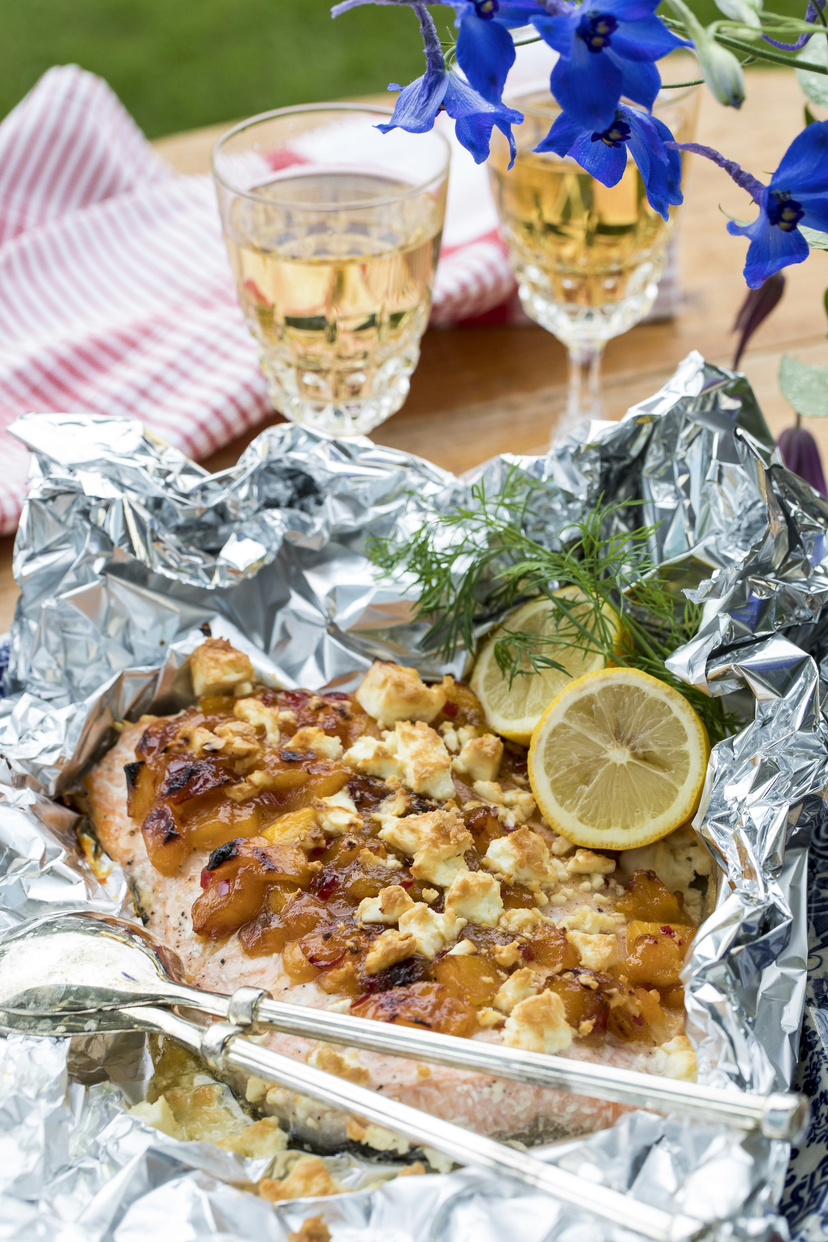 Grillad lax med citron, chili, mango och fetaost
