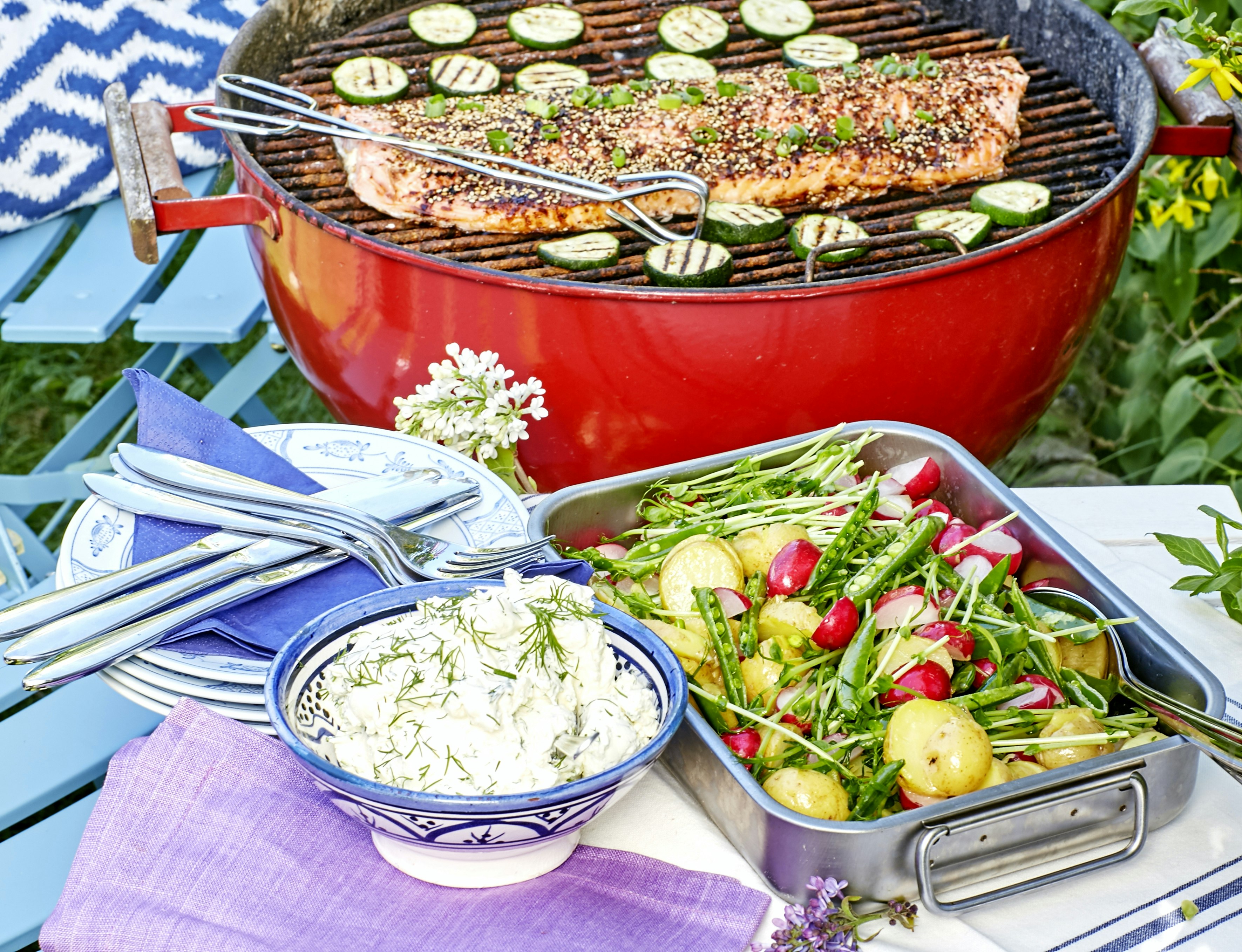 Grillad laxsida med potatissallad och dillkräm