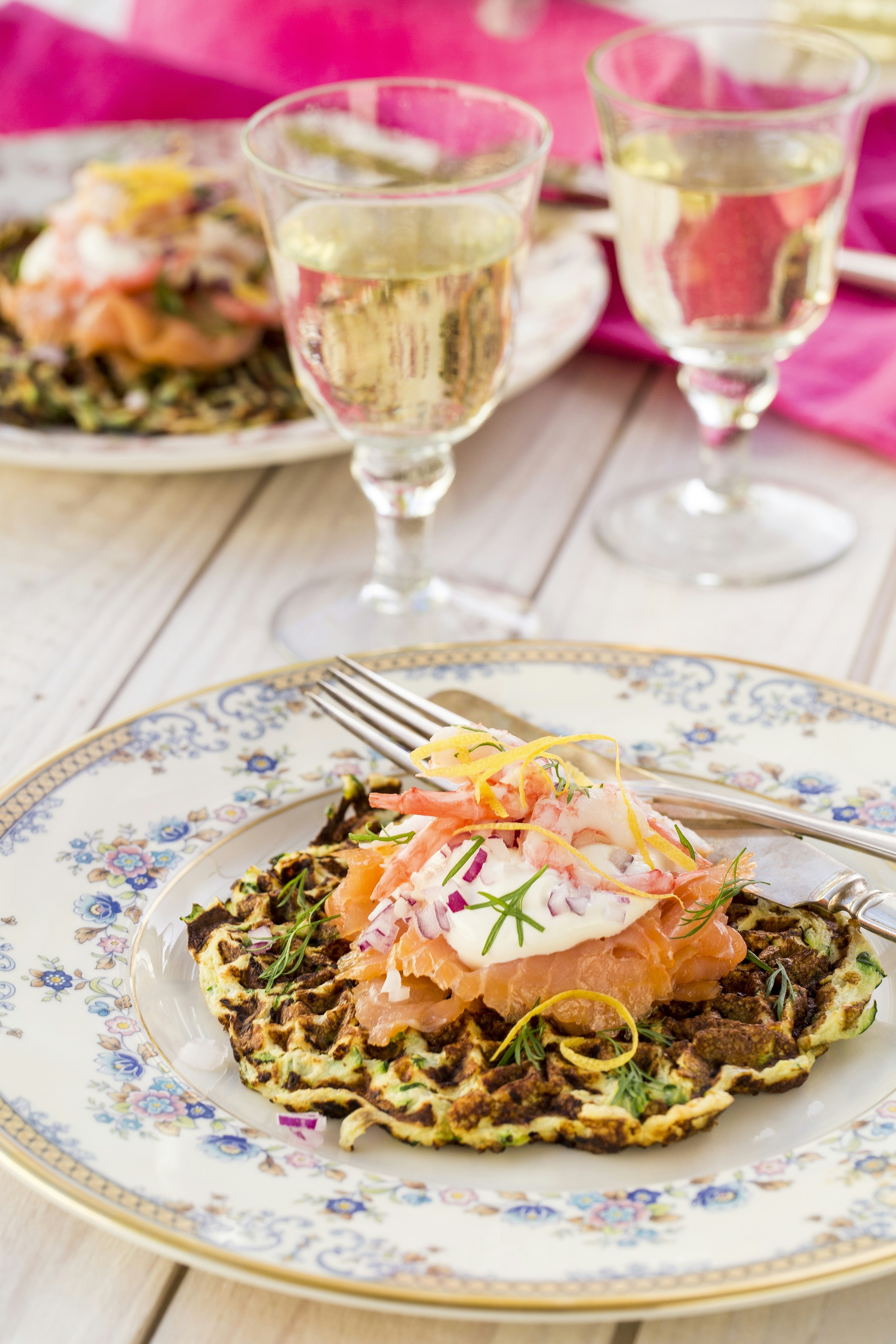 Gröna våfflor med lax och räkor