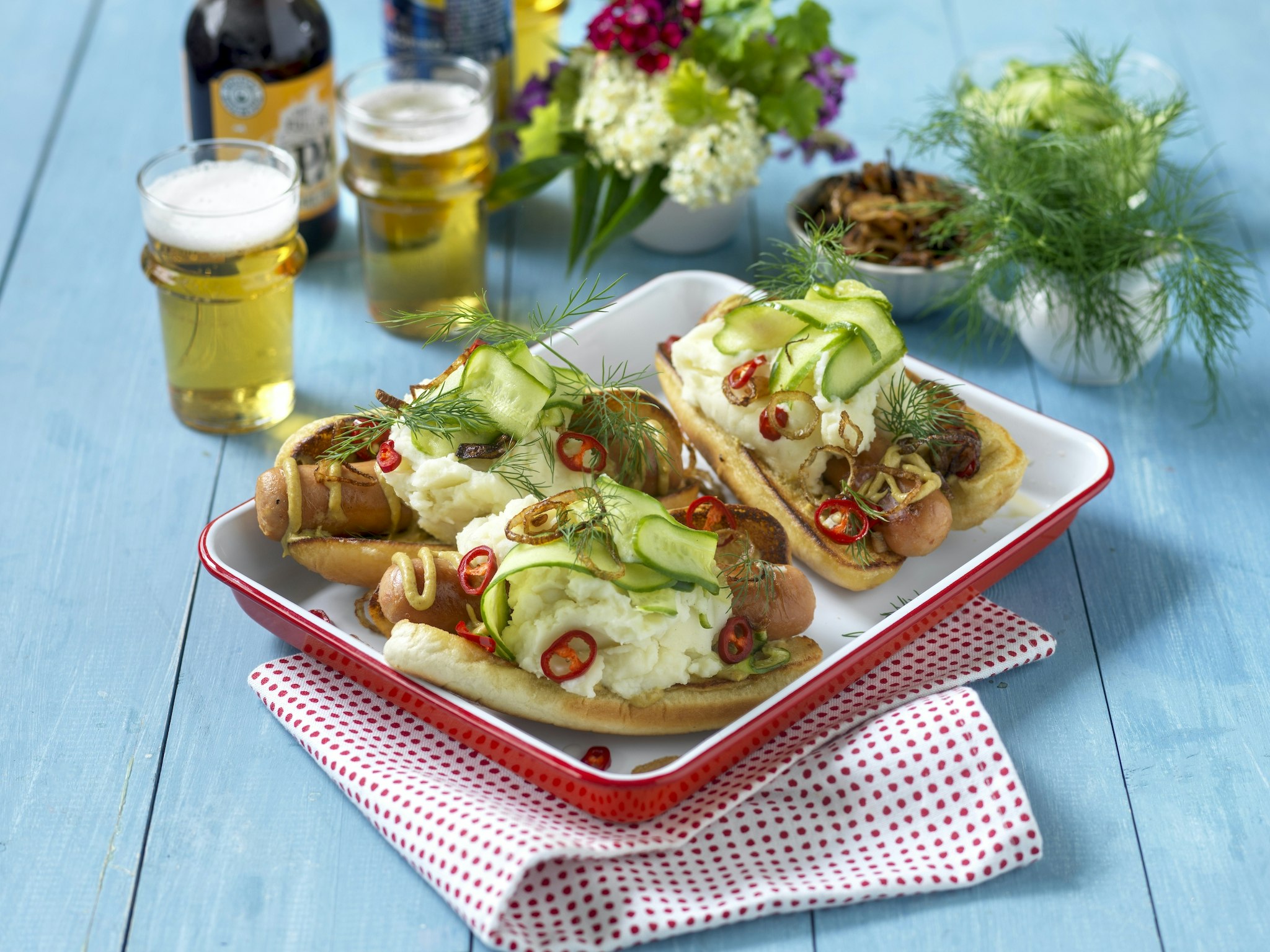 Korv i bröd med tre toppingar
