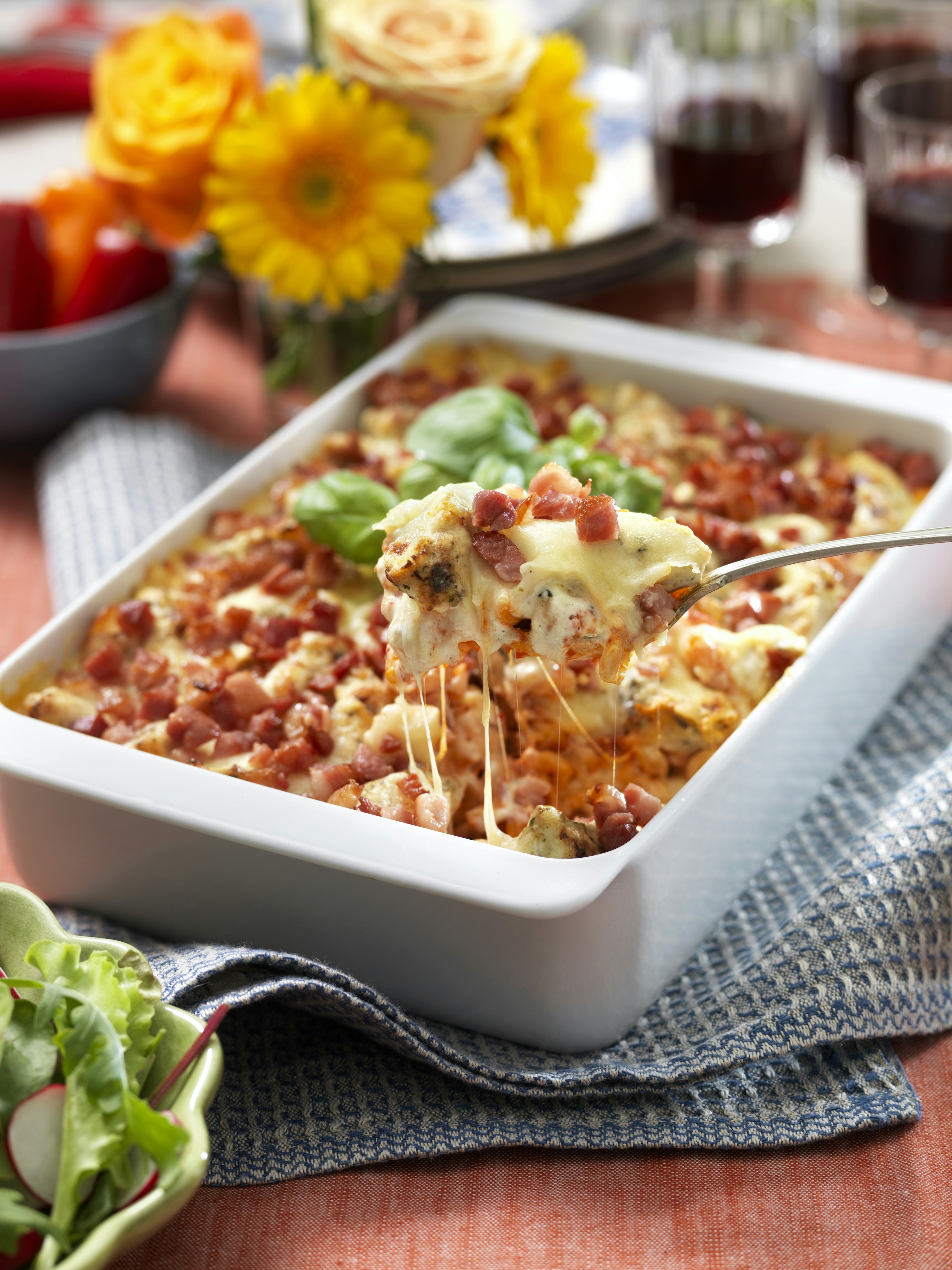 Krämig kyckling- och bacongratäng med pasta