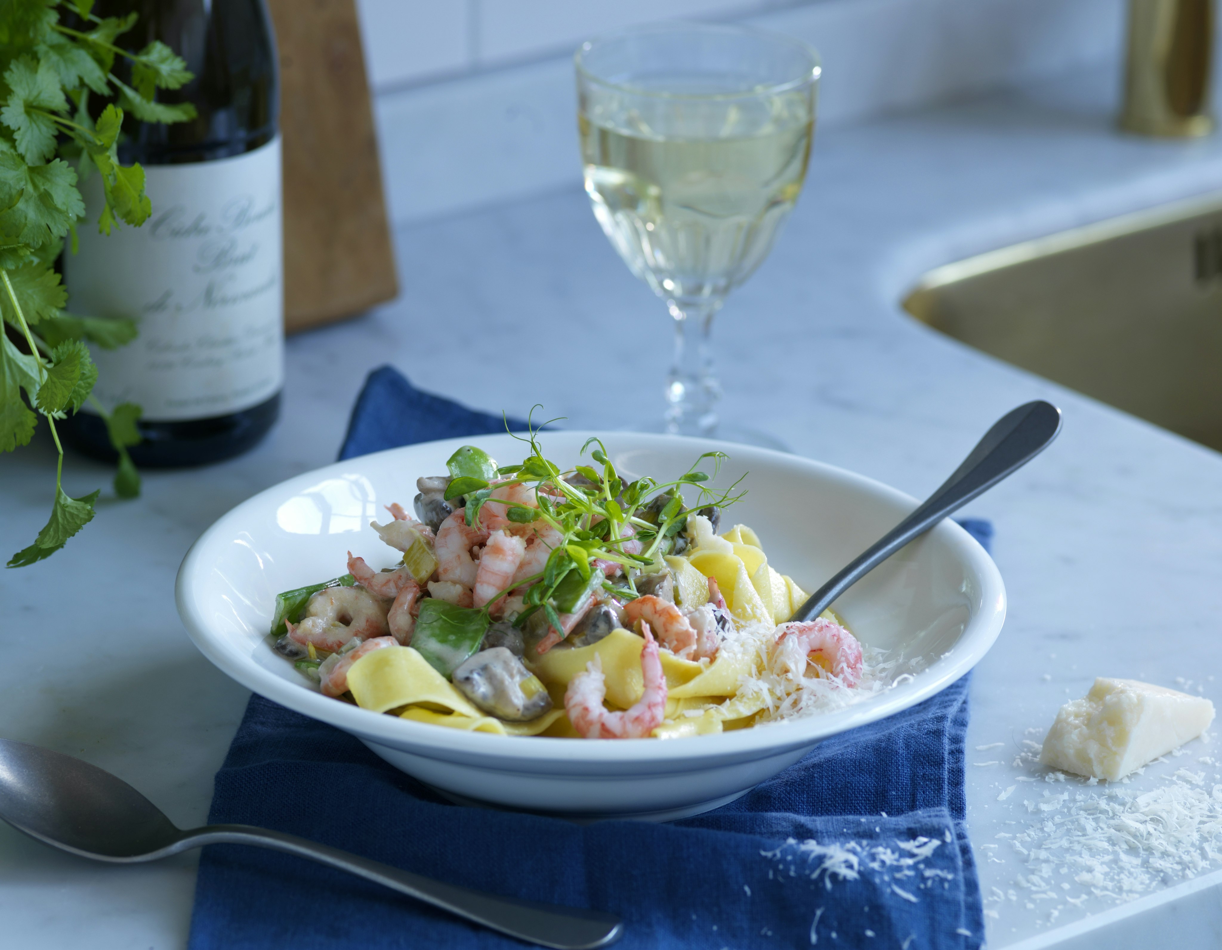 Krämig pasta med räkor och vitt vin