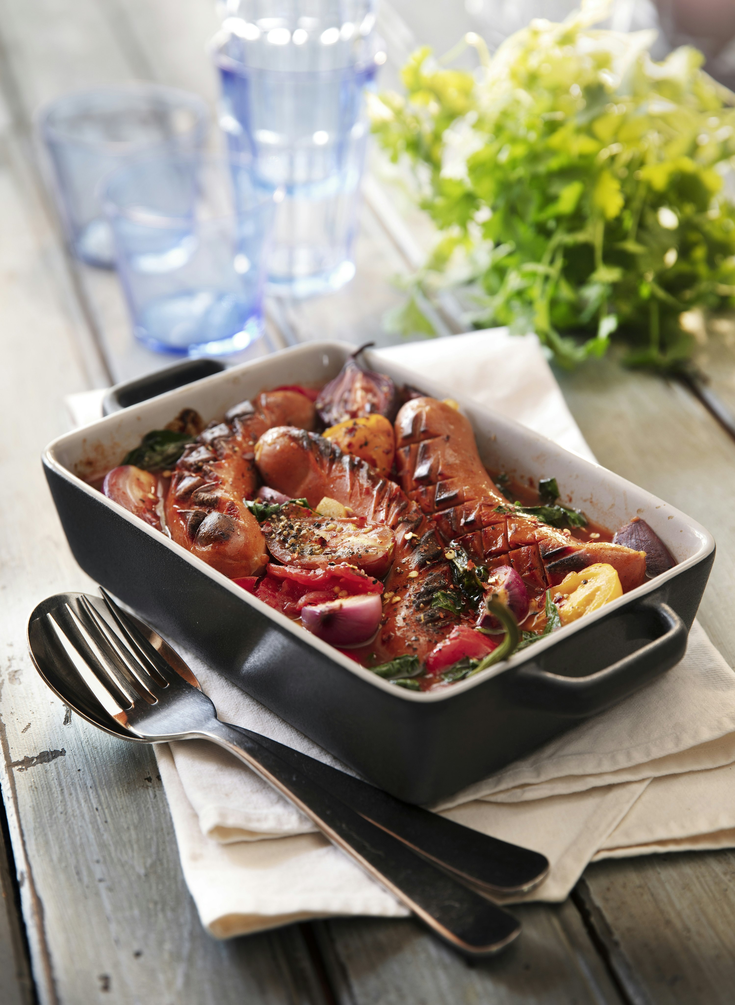 Kryddiga korvar med tomat och basilika