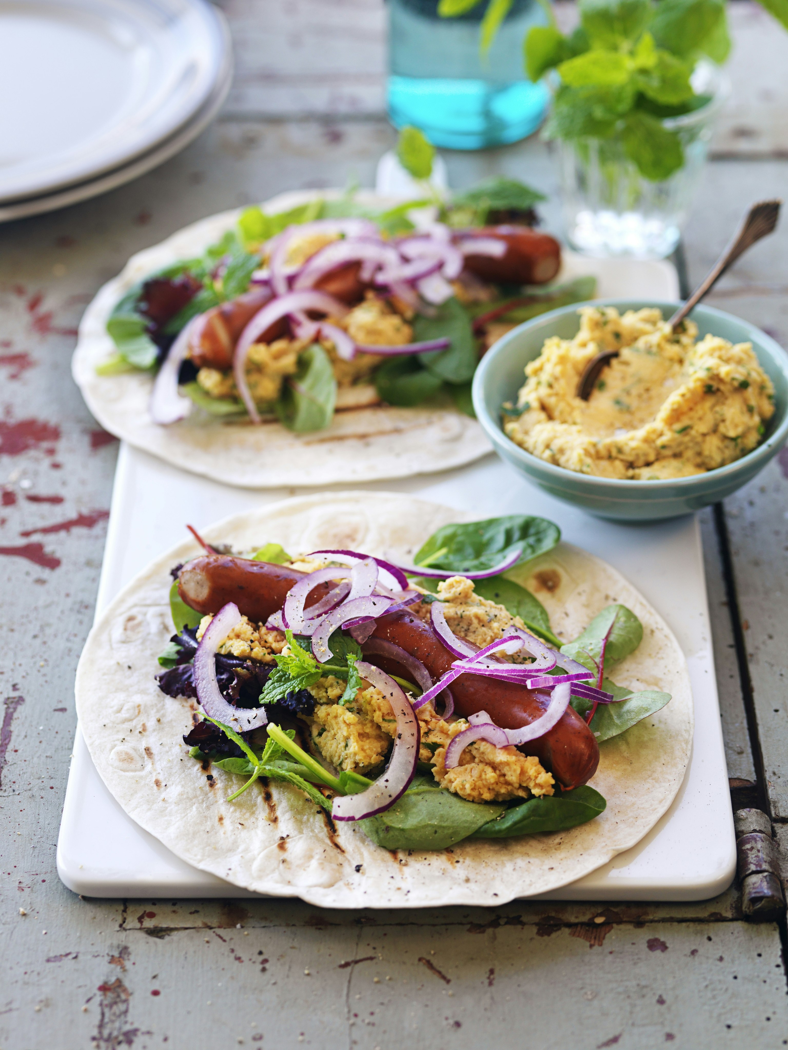 Kycklingkorv i tortilla med myntahummus