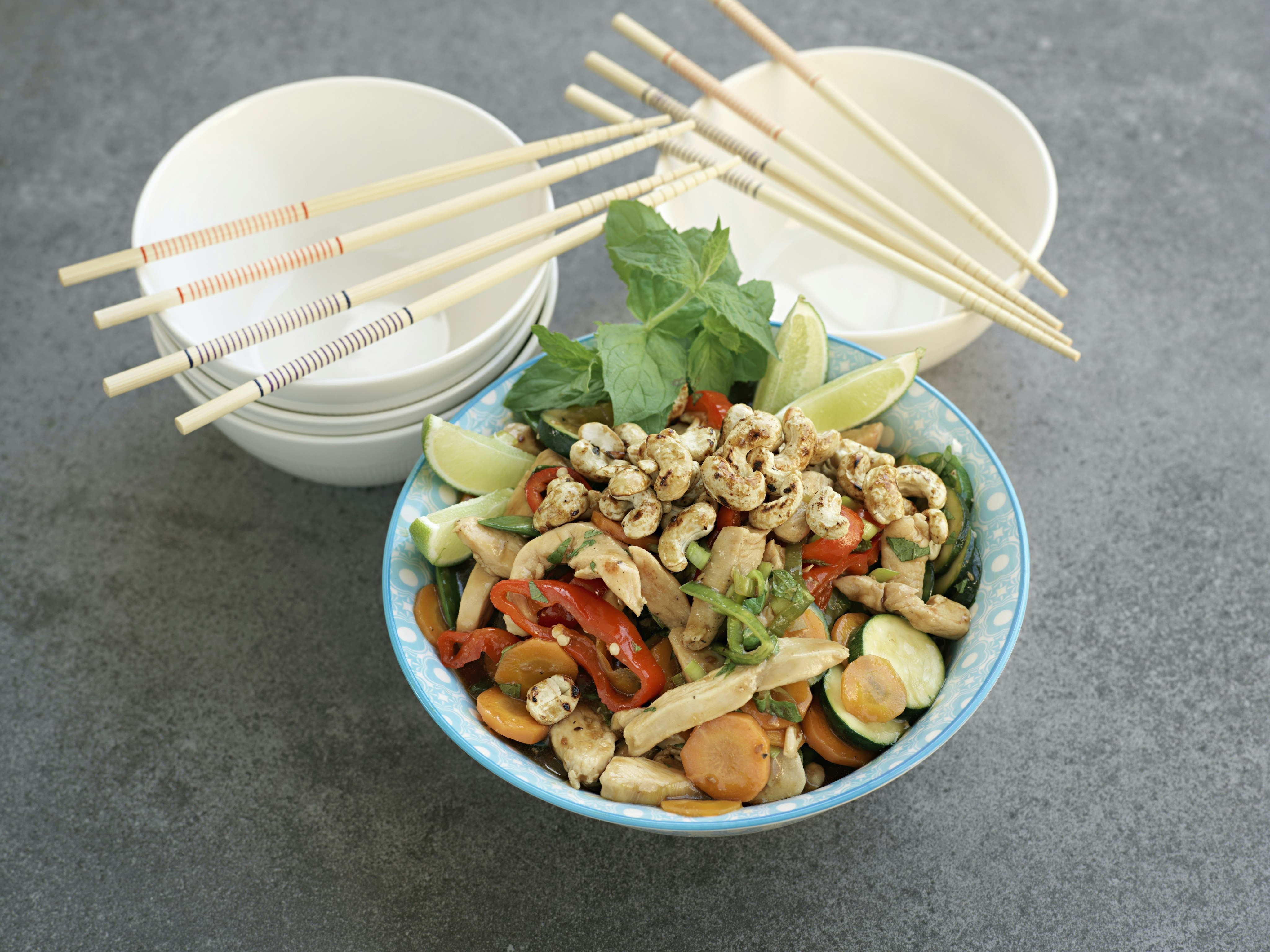 Kycklingwok med squash och cashewnötter i teriyakisås
