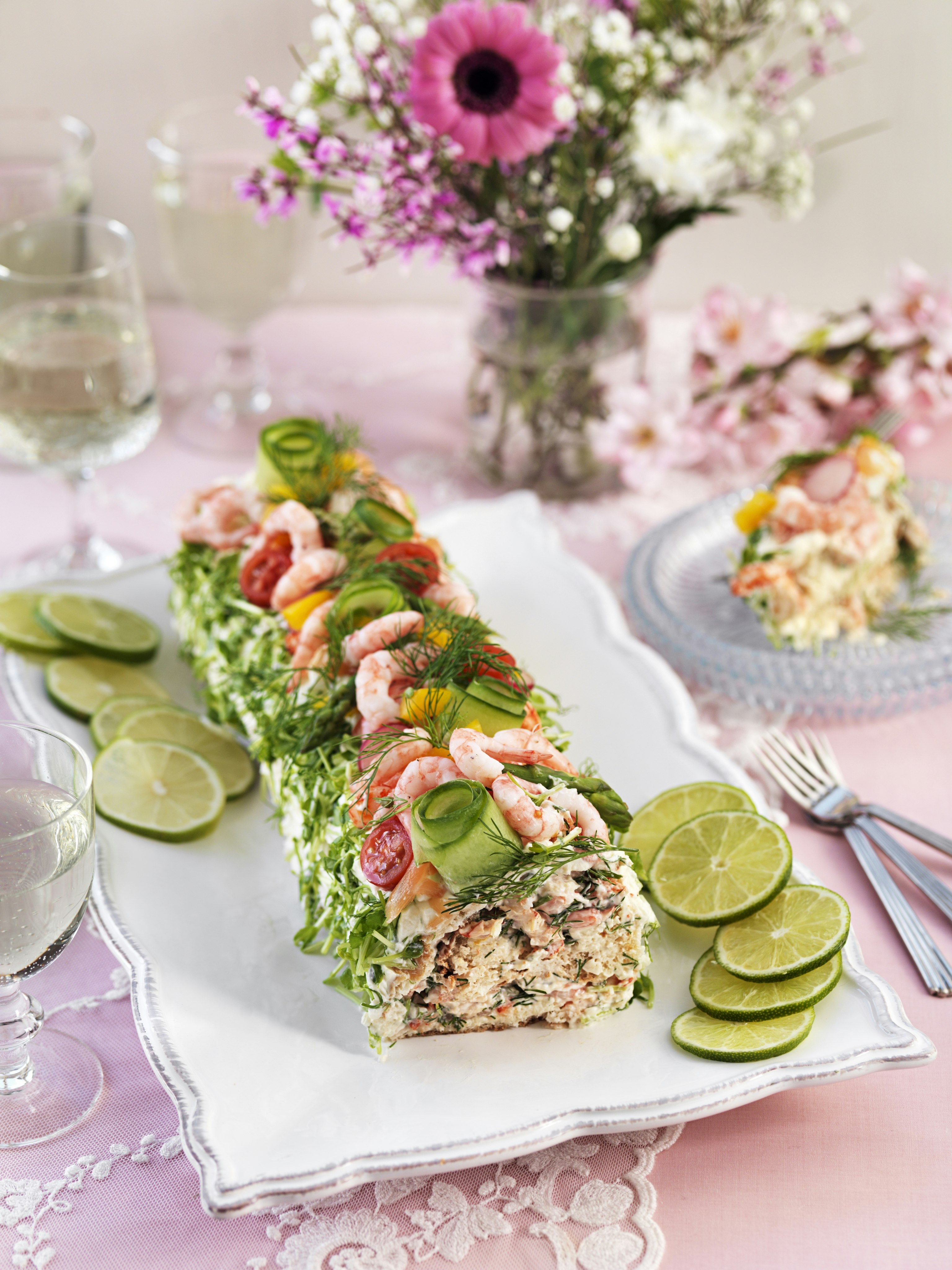Lyxig smörgåsrulltårta med skaldjur och lax
