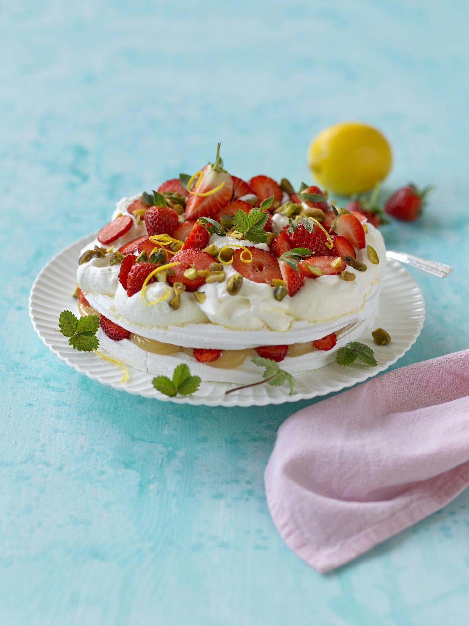Marängtårta med lemon curd och jordgubbar