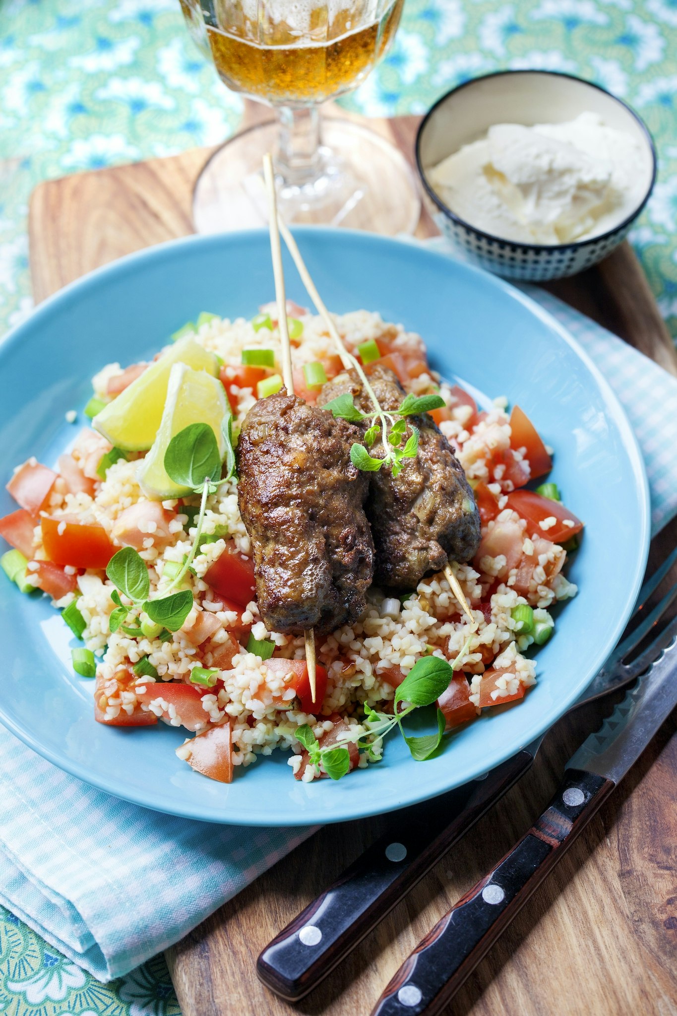 Orientaliska köttfärsspett med bulgursallad