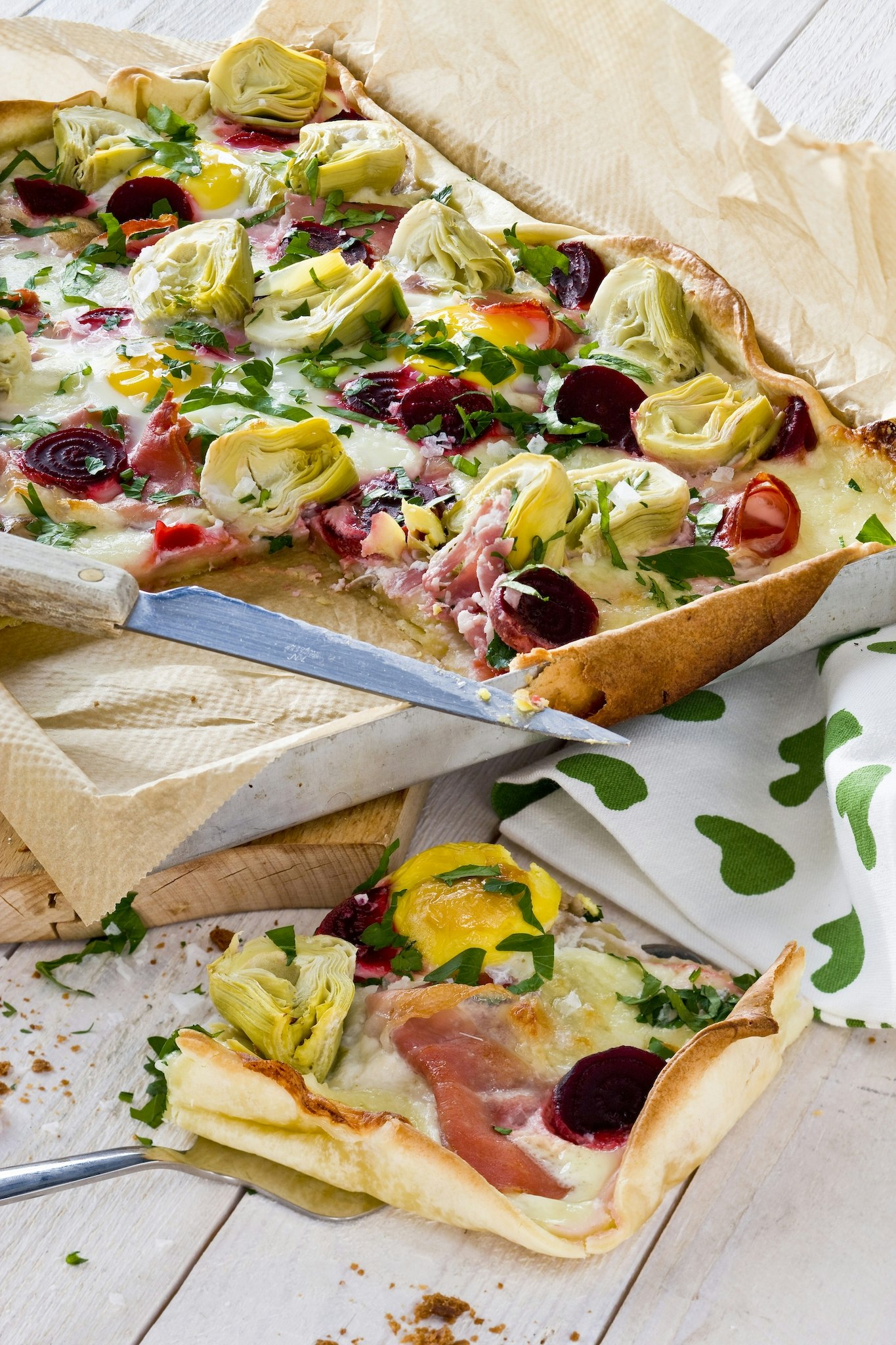Paj i långpanna med kronärtskocka och rödbetor