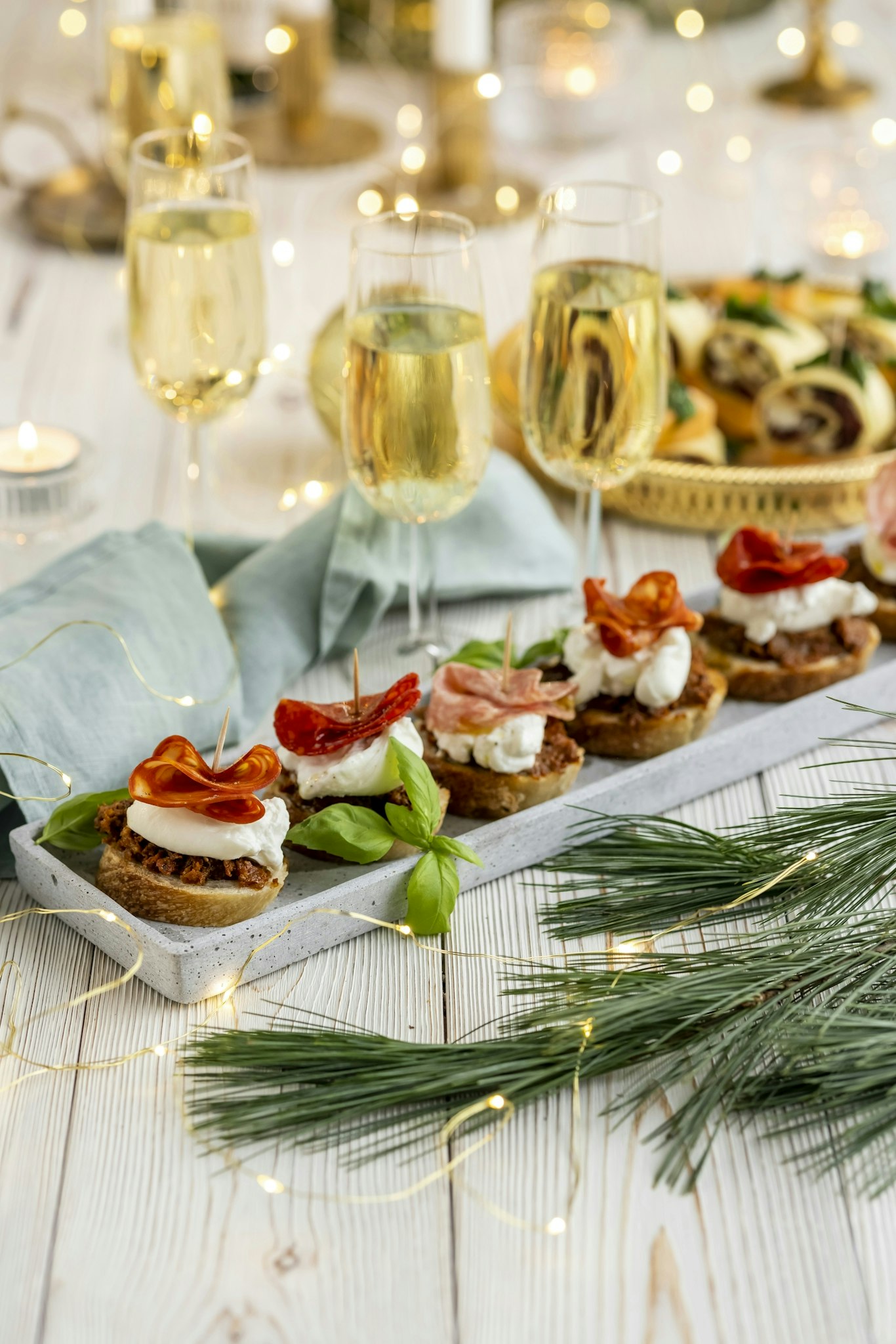 Pinchos med burrata, salami och soltorkade tomater