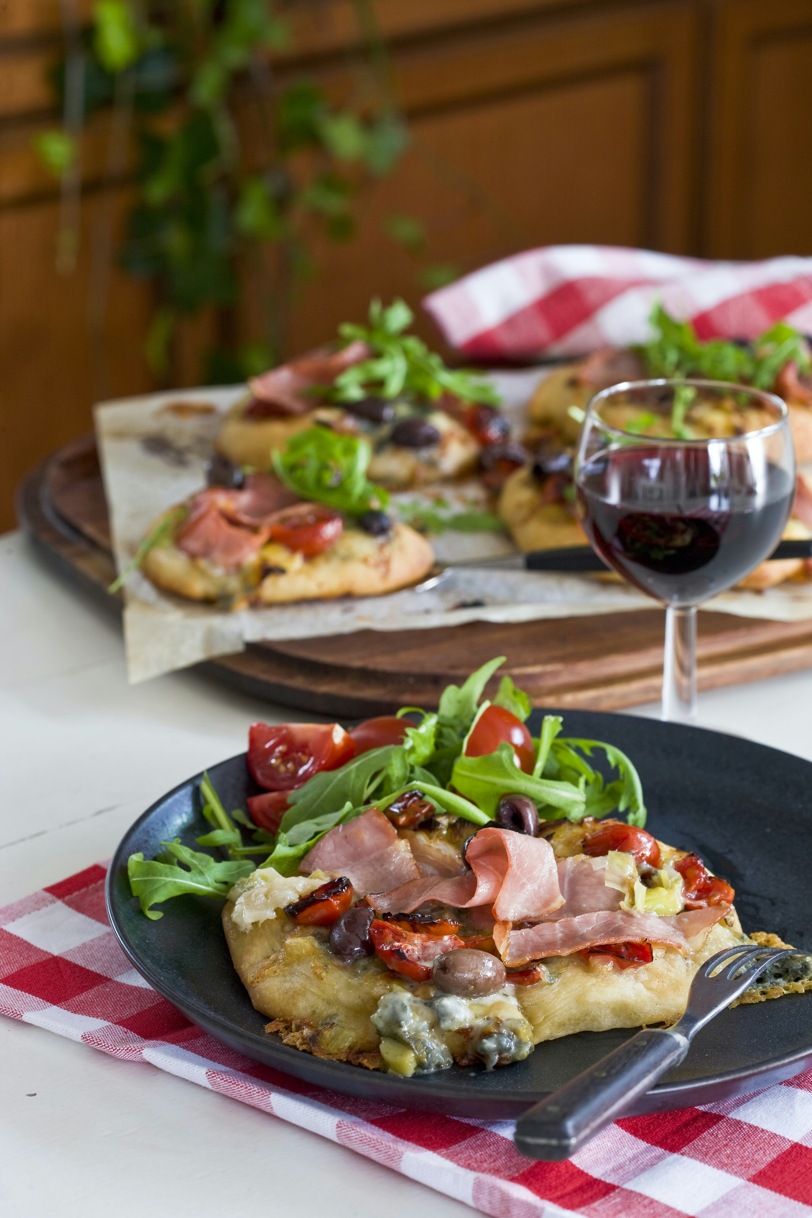 Pizza med gorgonzola och kallrökt skinka