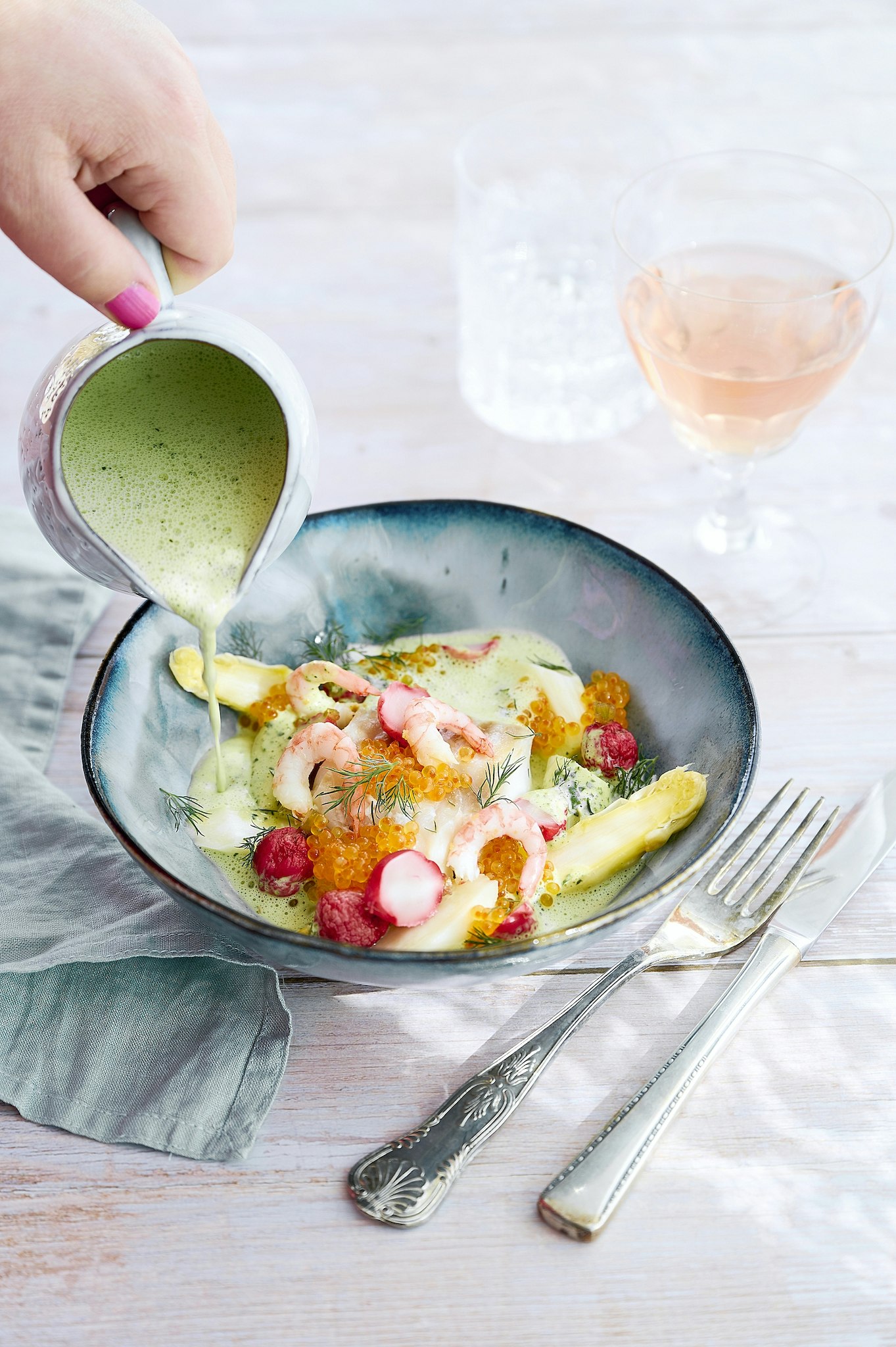Rimmad torsk med vitvinssås och räkor