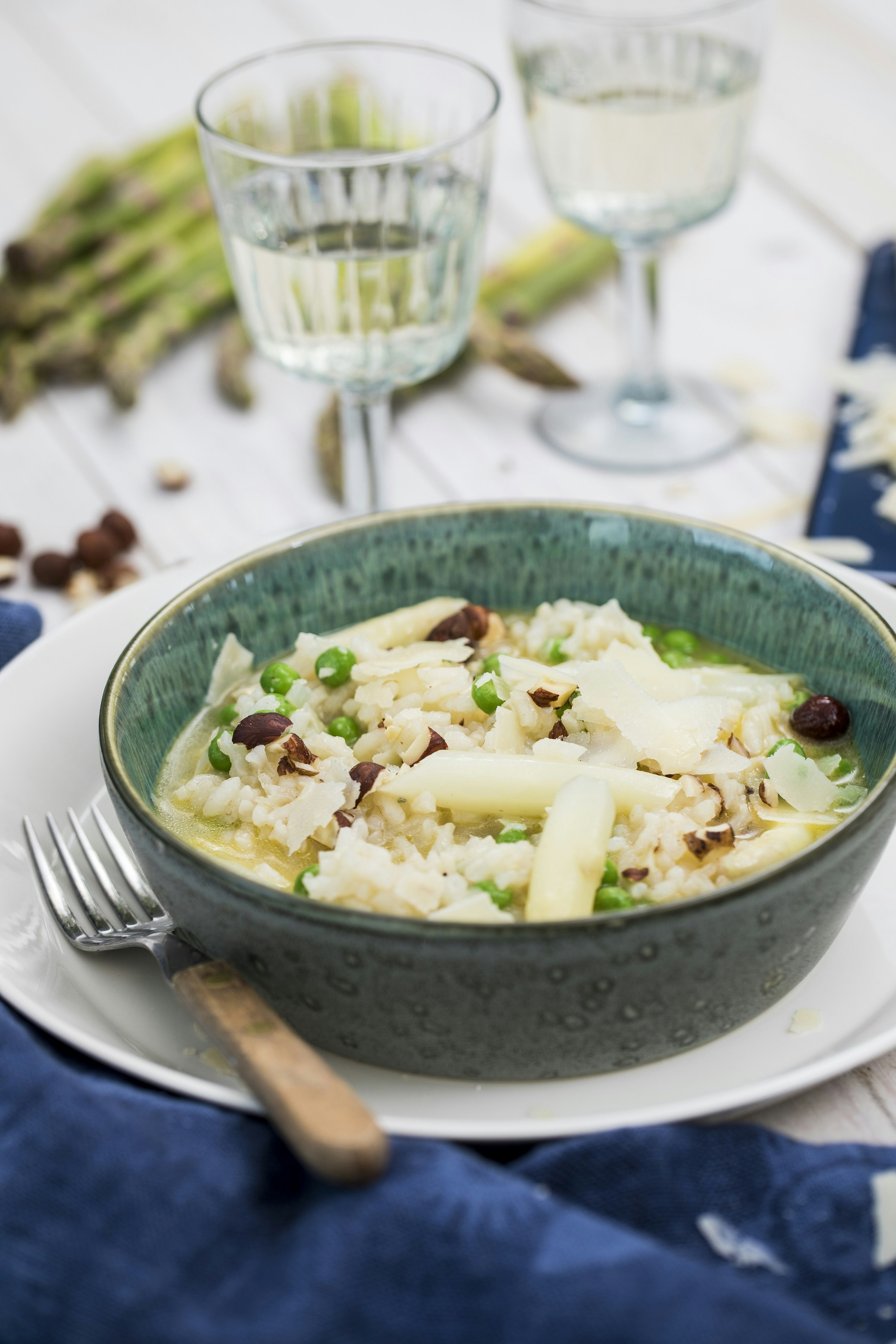 Risotto med vit sparris, gröna ärter och rostade hasselnötter