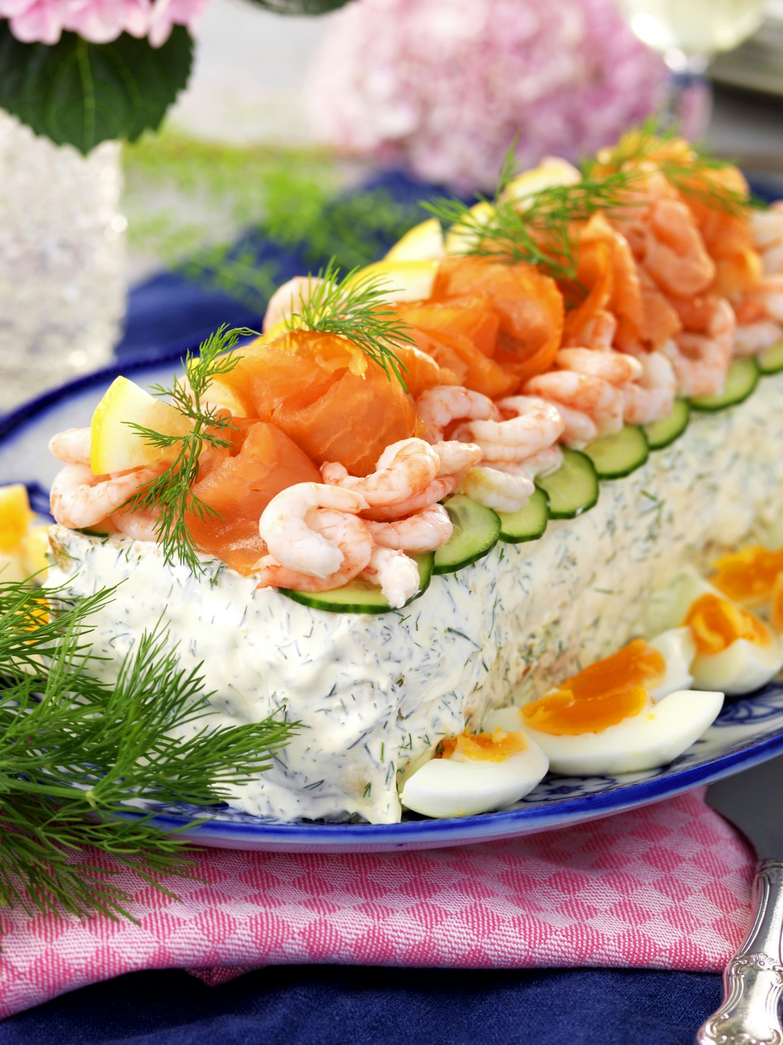 Smörgåstårta med lax, räkor och ägg