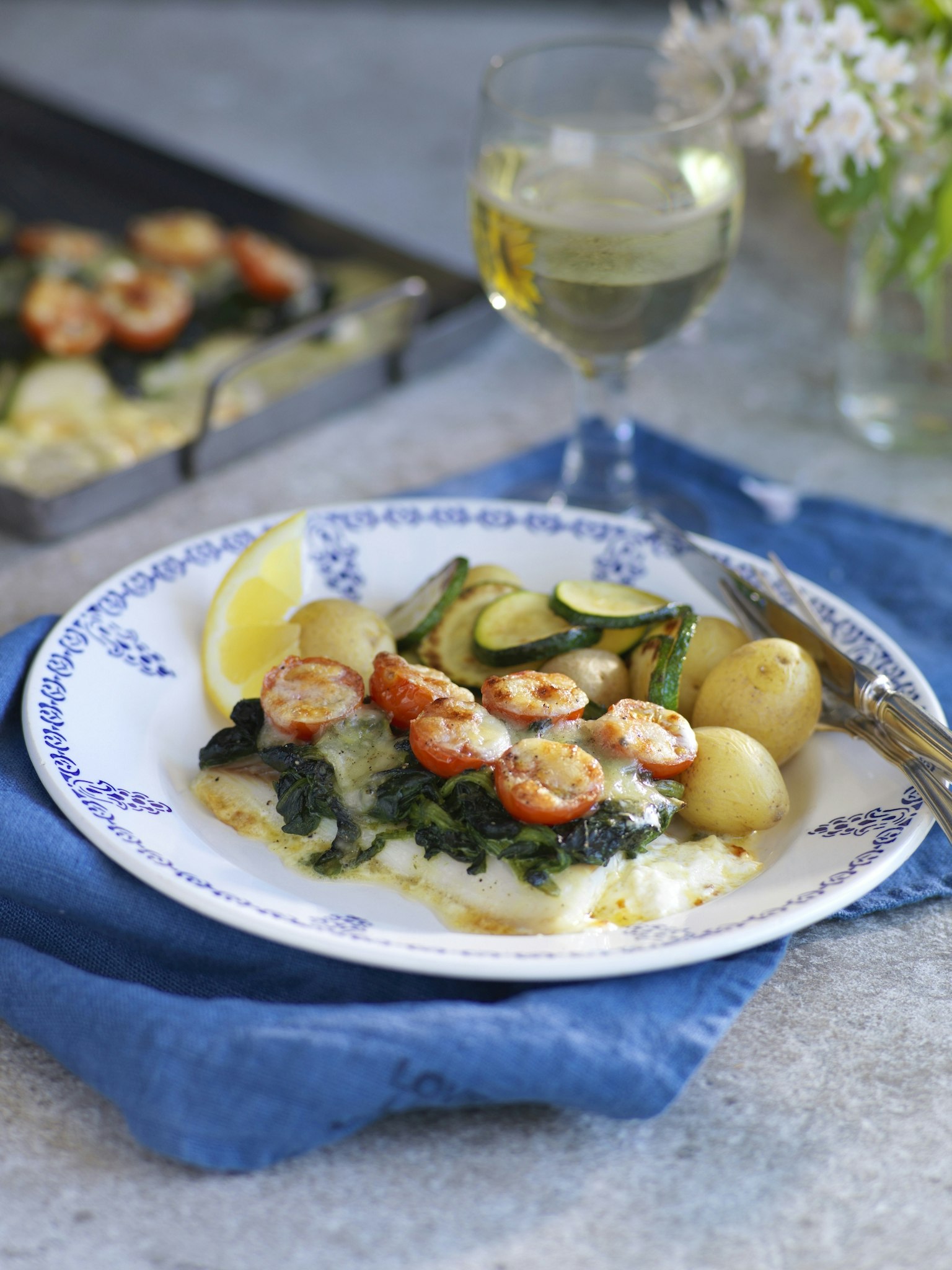 Ugnsbakad torsk med spenat och tomat